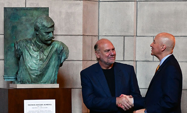 The induction ceremony, hosted by the Nebraska chapter of the American Institute of Architects, included presentations by Capitol administrator Bob Ripley, John Thomas Kimball, the architect’s nephew, and History Nebraska Director and CEO Trevor Jones. The Kimball family, along with artist John Lajba, also unveiled a sculpted bust of Kimball, which will be permanently displayed at the Capitol.