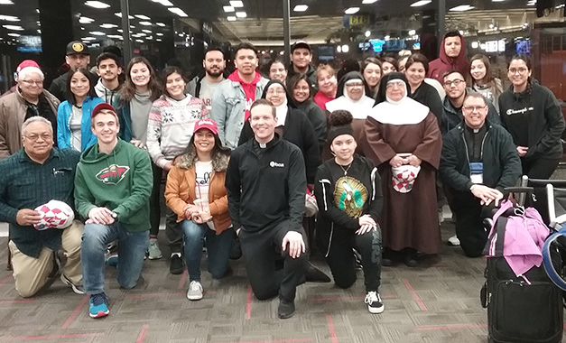 Father Carl Zoucha, pastor of Our Lady of Guadalupe Parish in Omaha, second row right, leads a group of 32 pilgrims departing Omaha’s Eppley Airfield Jan. 21 for Panama City to attend World Youth Day with Pope Francis. The group includes two priests, four women religious, a seminarian, adult chaperones, young adults and seven minors. For local coverage of the pilgrimage, see the next issue of the Catholic Voice. MIGUEL BARREIRO