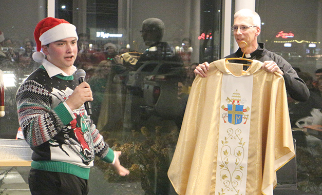 St. John Paul II Newman Center resident and University of Nebraska at Omaha student Jack Flaxbeard presents Father Joseph Taphorn with a St. John Paul II-themed chasuble and stole during a Dec. 13 community night at the center. More than 100 students came together to wish Father Taphorn well as he prepared to leave his post as pastor and director of the center to become rector of the Saint Paul Seminary School of Divinity in St. Paul, Minn., this month. Father Taphorn wore the vestments for the first time during his final Mass at the center on Christmas morning. Flaxbeard also is parish council member and liturgy committee chairman at the center.