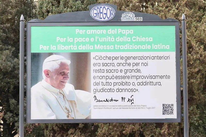 One of the two billboard designs featuring Benedict XVI includes a quote from the late pope’s 2007 apostolic letter Summorum Pontificum, which acknowledged the right of priests to offer Mass in Latin according to the 1962 Roman Missal.