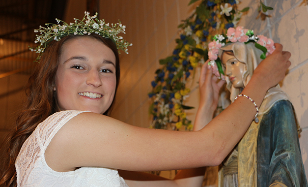 Allison Vana, senior class president at Mercy High School in Omaha, crowns a statue of the Blessed Mother during the school’s annual May Crowning May 6. A longstanding tradition at many Catholic schools, May Crowning ceremonies honor the Blessed Mother during May, a month dedicated to Mary. They usually include prayers, songs and the crowning of a statue of Mary with a circlet of flowers. Other May Crownings included a May 7 event at Marian High School in Omaha and a May 10 procession at All Saints School in Omaha, where about 160 students and 20 staff processed several blocks with a Mary statue from their school to St. Joseph Church, where they conducted the ceremony. COURTESY PHOTO