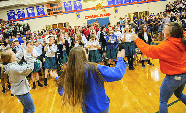 Rosie Brokke, left, a sophomore at Daniel J. Gross Catholic High School in Bellevue, helps fire up sixth-graders gathered Oct. 26 for the archdiocese’s annual Vocations Awareness Day at Gross Catholic. Assisting Brokke are classmate Rachel Culhane, center, and schoolmate Sophie Egermier, a junior. The special day for vocations has been held the past 14 years in the archdiocese. It includes music, Mass with Archbishop George J. Lucas and presentations by seminarians and men and women in religious communities. For more photos, click here