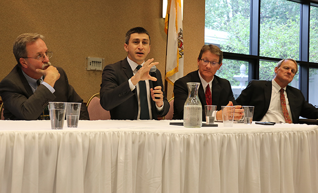Tom Venzor, executive director of the Nebraska Catholic Conference (NCC), speaks during a panel discussion on religious liberty at Christ the King Church in Omaha. He said the state should have a compelling interest, such as public safety, to justify interfering with actions based on sincerely held religious beliefs. The June 26 event focused on current threats to religious freedom in the United States. Also participating were, from left, Matt Heffron, attorney with the Thomas More Society; Deacon Tim McNeil, chancellor for the archdiocese; and Martin Cannon, Thomas More Society attorney. The Thomas More Society, a nonprofit, national public interest law firm supporting life, family and religious liberty, with an office in Omaha, cosponsored the event with the NCC to mark Religious Freedom Week (formerly Fortnight for Freedom) June 22-29. MIKE MAY/STAFF