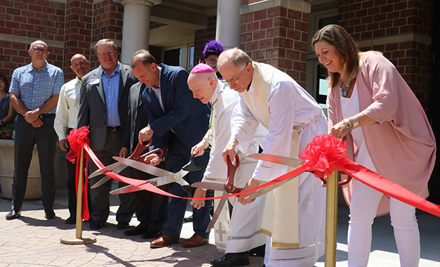 Archbishop George J. Lucas and Father Daniel Kampschneider, pastor of St. Vincent de Paul Parish in Omaha, join hundreds of parishioners June 16 for a ribbon cutting to open their new Parish Center. People then entered the center for a dedication ceremony and blessing by the archbishop, a celebration meal and self-guided tours. The two-story, 29,000-square-foot facility includes a large hall, meeting rooms, kitchen and an outreach center/food pantry. Nearly 1,300 families and individuals donated nearly $7.3 million to build the facility.