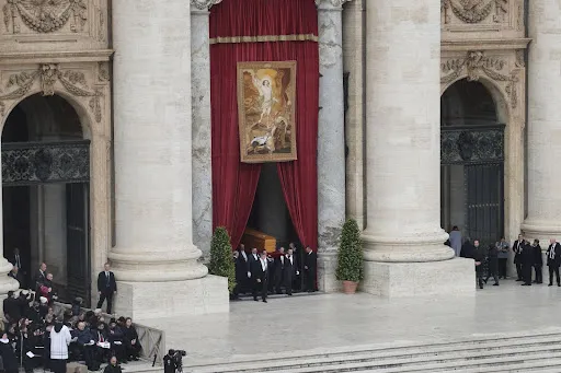 Benedict XVI’s coffin exits St. Peter’s Basilica beneath an image of Christ’s resurrection on the morning of his funeral Jan. 5, 2022 / Evandro Inetti/CNA